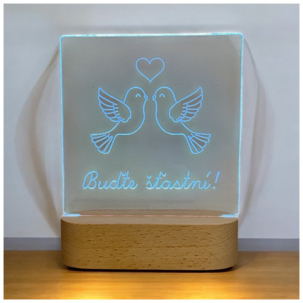 Jemná a elegantná LED lampa s obrázkom dvoch holubíc a nápisom „Buďte šťastní!“ je krásnym a originálnym darčekom pre novomanželov. Vďaka decentnému podsvieteniu vytvára príjemnú atmosféru a zároveň ostáva trvalou spomienkou na výnimočný deň.