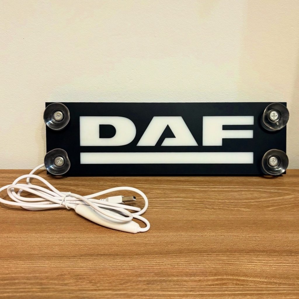 LED tabuľka DAF je štýlový doplnok do kabíny kamiónu. Vyrobená z akrylu s logom DAF a farebným LED podsvietením. Jednoduchá montáž pomocou prísaviek, napájanie cez USB. Perfektná dekorácia pre každého vodiča DAF!